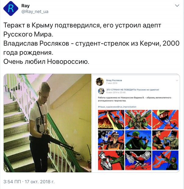 Более того, началась активная кампания по натягиванию совы на глобус на основании одного единственного репоста, сделанного убийцей ещё 4 года назад. Подборка агитационных плакатов с символикой ДНР, размещённая им в соцсети ВКонтакте без каких либо комментариев, уже породила легенду, претендующую на «правду в последней инстанции» о том, что керченской стрелок - сторонник ДНР. Со всеми вытекающими из этого последствиями.