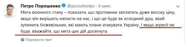 Перевожу на человеческий: «Цель военного положения – показать, что противник заплатит очень высокую цену, если решит напасть на нас, и что это будет как холодный душ для сумасшедших, которые имеют намерения атаковать Украину. И если агрессии не будет, считайте, что цель этих действий достигнута!»