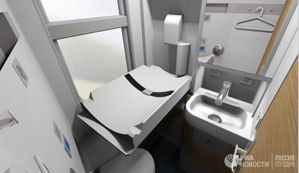 Интерьер концепта выполнен в светлых тонах, сами полки — в серых с красными подголовниками. Столики и перегородки — в цветах светлого дерева. В туалетах — гигиенические души, пеленальные столики, автоматические краны, дозаторы мыла, бумажные полотенца, встроенный фен для рук.