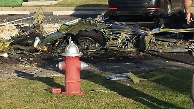 Самолет упал на стоянку рядом с жилым комплексом. Несколько автомобилей повреждены. Происшествие произошло в субботу около трех часов дня.