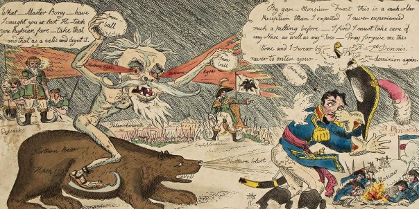 Одна из первых карикатур — «Джек Фрост атакует Бони в России» (Бони — насмешливое прозвище Наполеона, придуманное англичанами). На ней — ужасный старик — воплощение льда и холода, преследует Бонапарта верхом на медведе и кричит ему вслед: «Отведай-ка русского угощенья»!