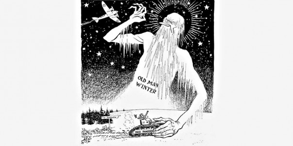 Вот, например, «Старик Зима» — старинное английское воплощение снегов и метелей. На этой карикатуре он останавливает немецкие танки, движущиеся на Москву, и наблюдает за самолётом британских королевских ВВС.