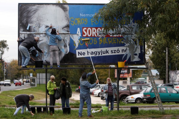 Венгерские активисты срывают плакат с изображением Джорджа Сороса