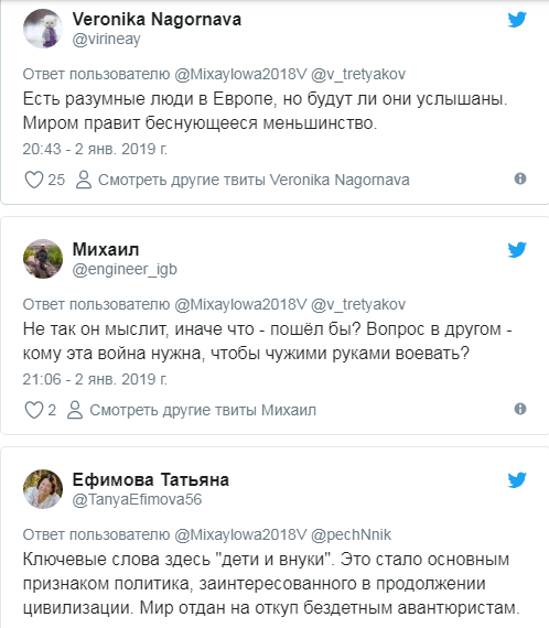 Отвечая разного рода безумцам из СМИ, активно продвигающим эту идею, немецкий журналист Ули Геллерманн спросил: "Вы что, хотите, чтобы кто-то рискнул на войну с Россией? Я стар, у меня есть дети и внуки, я не хочу, чтобы они шли на любую войну, особенно с Россией! на войну, в которой невозможно победить!"