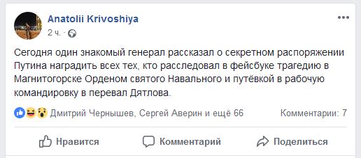 И, конечно, украинские нацисты не смогли упустить случая запустить очередную кампанию дезинформации. В интернете появились массовые рассказы «дочерей металлургов» о том, что якобы здание в Магнитогорске взорвалось из-за накануне вселившихся в него террористов. И будто при неосторожном обращении взорвался гексоген (хотя свидетели с места говорят, что перед взрывом сильно пахло газом).