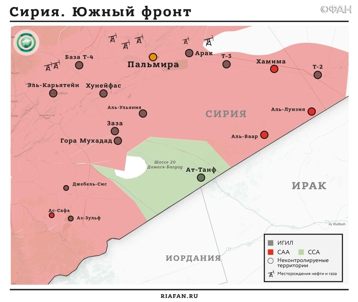 В частности, были изъяты ручные гранатометы и снаряды к нему. Между тем в отдельных областях Сирийской Пустыни к югу от шоссе Пальмира – Дейр-эз-Зор иногда все еще фиксируются перемещения остатков ИГ. Многие местные источники уверены, что их жизнеспособность поддерживается с американской базы «Ат-Танф», находящейся на юге региона у границ с Иорданией и Ираком.