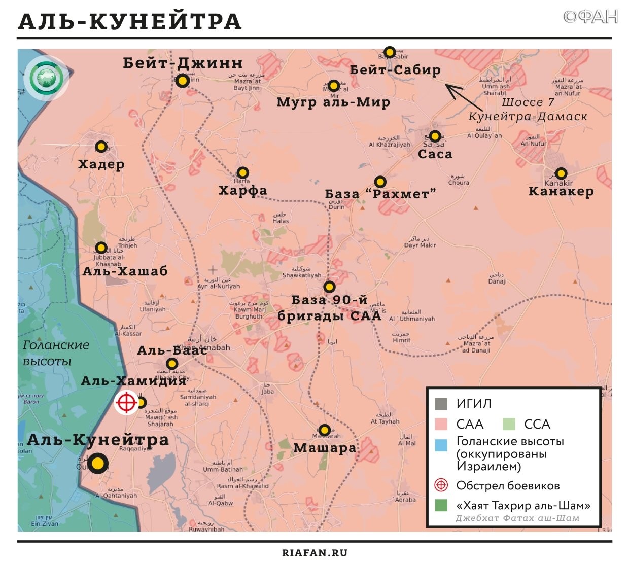 Армия обороны Израиля (ЦАХАЛ) выпустила несколько ракет и артиллерийских снарядов по территории Сирии. По информации новостного агентства SANA, ударам подвергся госпиталь в Эль-Кунейтре. Другой целью Тель-Авива стал наблюдательный пост ООН в населенном пункте Джуббата Аль-Хашаб. Согласно предварительным сведениям, пострадавших нет, однако инфраструктура региона понесла значительный ущерб. Полный масштаб разрушений в настоящее время устанавливается.