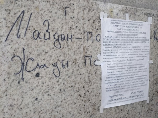 Подземный переход к майдану Независимости усыпан всевозможными граффити, некоторые остались еще со времен оранжевой революции и Януковича. Другие — новенькие, трафаретными алыми буквами: «Вставай, Бандера!» провожают прохожих. Рядом менее заметная надпись, выцарапанная неровным почерком: «Майдан. Покойся с миром!». Целлофановые пакеты, пустые пачки от сигарет, бутылки разбросаны по углам, ближайшие урны доверху забиты мусором.