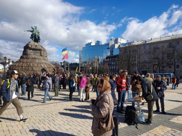 Подростки в светло-серой камуфляжной форме проносят желто-голубые флаги. Обернувшись на проходящих, митингующие всего на несколько секунд замолчали, набрали полную грудь ледяного воздуха, будто бы забыв сделать столь жизненно необходимый выдох. За ребятами следует молодёжь с желтой надписью на спине «Национальная гвардия». Время. Центральные улицы перекрыты для автомобилистов. Неровными, разбивающимися случайными прохожими рядами по пять человек, люди выдвинулись к сотне.