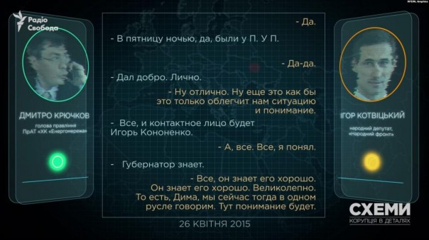 Журналисты обнародовали записи телефонных разговоров Кононенко с бывшим председателем ЧАО Холдинговая компания «Энергосеть» Дмитрием Крючковым, владельцами ФК «Динамо» братьями Игорем и Григорием Суркисами, нардепом от «Народного фронта» Игорем Котвицким и прочими. В частности, указанные лица в разговорах разрабатывают незаконные способы получения и сохранения контроля над областными энергоснабжающими компаниями, а также обсуждают распределение между участниками схемы значительных сумм.