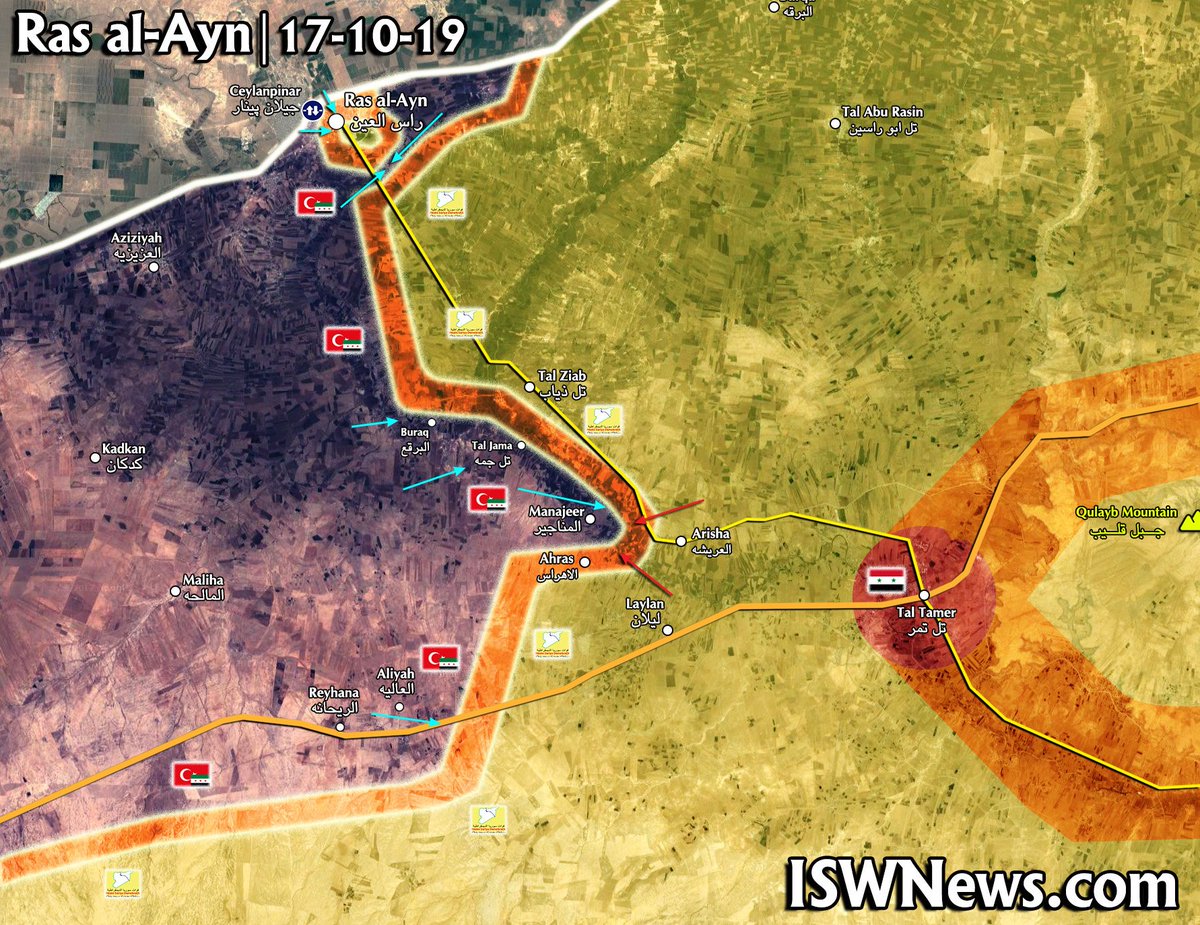 Каких конкретно территорий это касается, не разглашается. Также как и то, где пройдет линия разграничения, так как на текущий момент ее лишь более-менее согласовали в районе Манбиджа. В Кобани и Камышли уже сидят сирийцы. Таль-Абьяд взят, а вот Рас-аль-Айн никак не поддается. Сегодня курдские силы в городе были отрезаны, так как СНА перерезала дорогу Рас-аль-Айн-Таль-Темер, в районе которой уже 2 дня идут бои между турками/СНА и курдами/САА, которые также затрагивают кусок дороги M4 идущей в Таль-Темер.