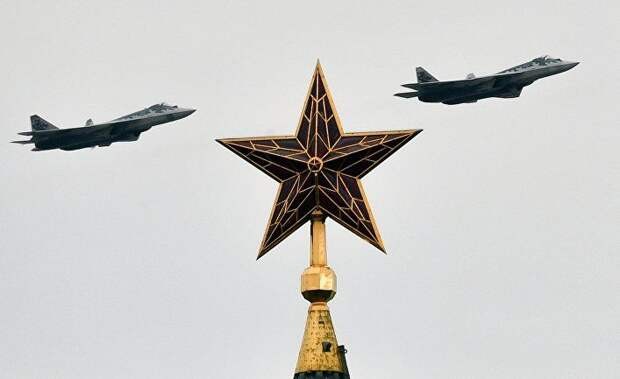 Российские многофункциональные истребители пятого поколения Су-57 на воздушном параде Победы в Москве