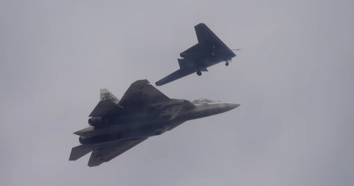 Новейший ударный беспилотник "Охотник" во время первого совместного полета с истребителем Су-57