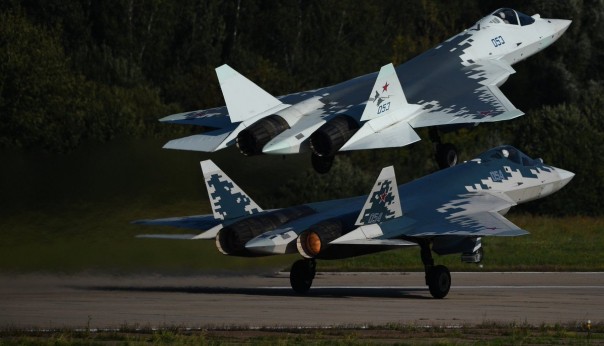 Российские многофункциональные истребители пятого поколения Су-57 на Международном авиационно-космическом салоне МАКС-2019