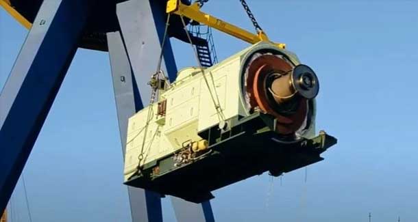 Погрузка главного газотурбинного агрегата М90ФР производства ПАО «ОДК-Сатурн» на фрегат «Адмирал Головко» на ПАО «Судостроительный завод «Северная верфь», декабрь 2020 года (с) кадр из видео ПАО «Судостроительный завод «Северная верфь».