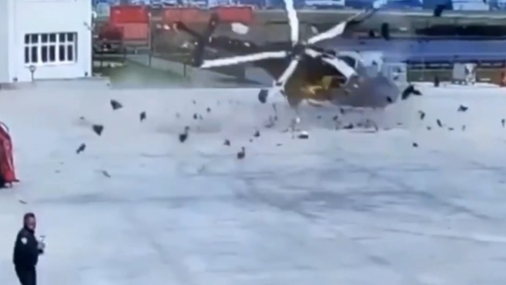 На записи видно, как вертолет AgustaWestland AW169, экипаж которого готовился к взлету, внезапно начал раскручиваться вокруг своей оси, после чего завалился на бок, ломая лопасти.