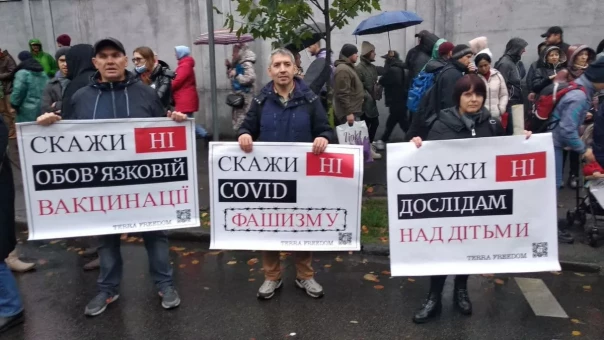 В руках у них плакаты с надписями «Нет ограничению прав и свобод», «Имеем право выбирать», «Люди Украины – не молчаливые животные», «Скажи «нет» ковид-геноциду», «Скажи «нет» ковид-паспортам» и так далее.