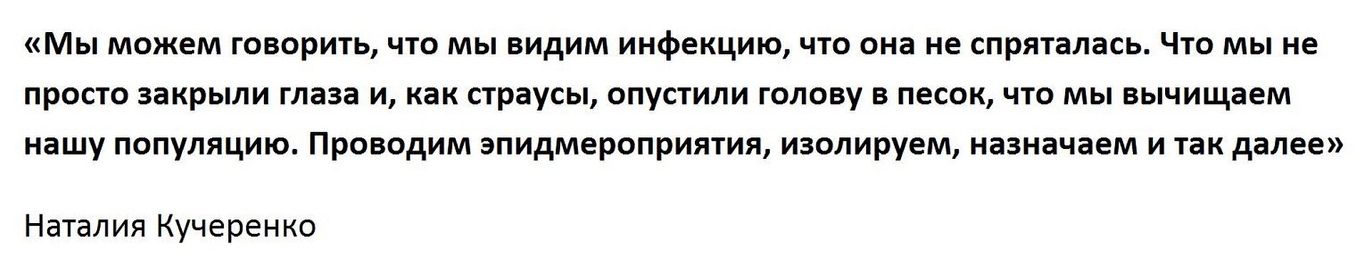Выступая перед товарищами и господами, остро заинтересованными в победе над проклятым коронавирусом и воцарением всеобщего народного здоровья, глава регионального Роспотребнадзора Нижегородской области Наталия Кучеренко заявила, что она и её бесстрашные соратники не зарываются головой в песок, как страусы, а успешно «вычищают популяцию» народонаселения России.