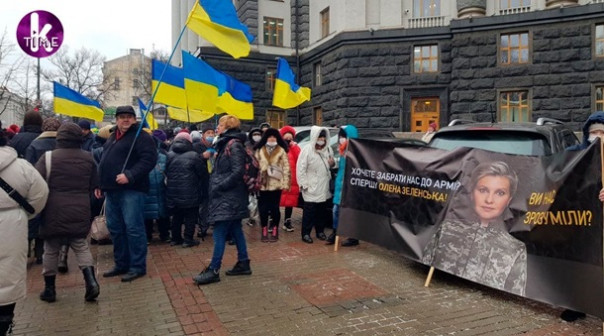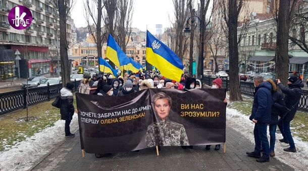 Протестующие несли с собой несколько больших баннеров, главный из которых – с первой леди Украины Еленой Зеленской в военной форме и подписью: "Хотите забрать нас в армию? Сначала Елена Зеленска! Ви нас поняли?", а также флаги Украины.