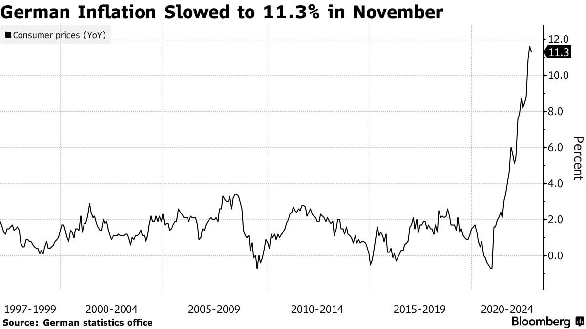 В ноябре 2022 года Федеральное статистическое управление Германии зафиксировало рекордный с 1951 года рост потребительских цен. Не такие уж и сытые бюргеры нищают со скоростью 11,3% годовых. Если в предыдущие месяцы 2022 года основной вес составляло повышение цен на энергетику (38,4% годовых по ноябрьским ценам), то с октября к ним прибавилась продовольственная инфляция, которая в ноябре превысила 21% годовых. Оба фактора вызваны исключительно и только бумерангом русофобских санкций.