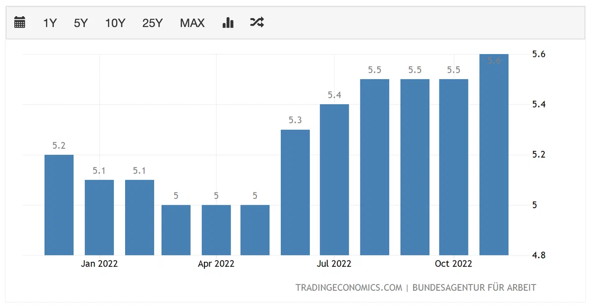 В ноябре 2022 года рост безработицы ускорился, и уже превышает аналогичный показатель ноября 2021 года на 117 000 душ. На текущий момент процент безработных немцев колеблется в районе 5,6%. Лидеры — Бремен с 10,4% работоспособных бюргеров и Берлин с 8,9%.
