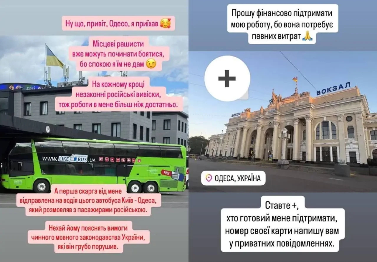 «Привет, Одесса, я приехал! Местные рашисты уже могут начинать бояться, потому что в покое я их не оставлю. На каждом шагу незаконные русские вывески, так что работы у меня более чем достаточно».