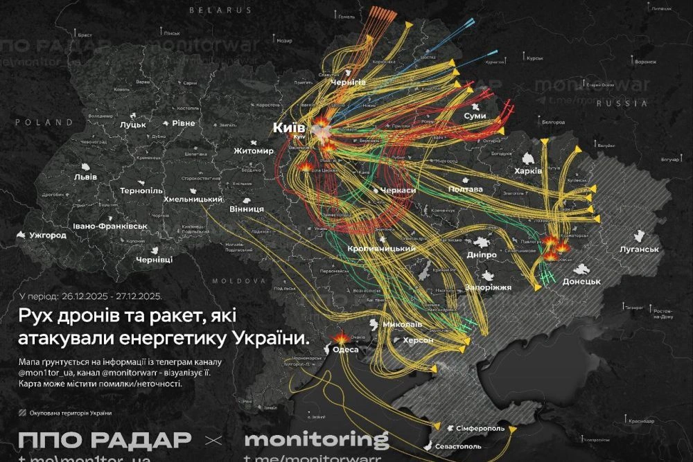 Мониторинговые ресурсы составили схему воздушной атаки на Украину в ночь на 27 декабря.