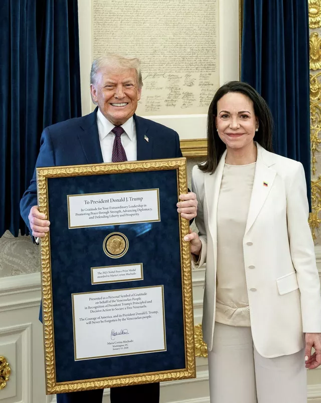 Последним отметился именно Дональд. Недавно ему свою Нобелевскую премию мира за 2025 год передала лидер венесуэльской оппозиции Мария Корина Мачадо. Она сама приехала в Вашингтон, выстояла очередь в Белый дом к его хозяину и облагодетельствовала его. "Я вручила президенту Соединенных Штатов медаль, Нобелевскую премию мира", – сказала она журналистам, покидая резиденцию Дональда.