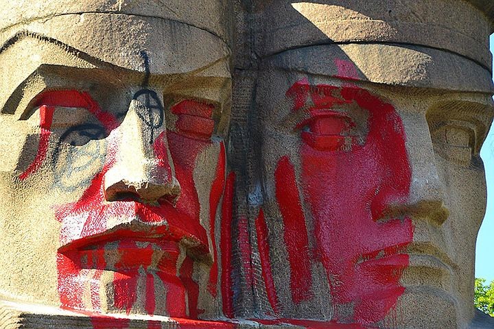 Били-били, не разбили. Памятник чекистам в Киеве долбили кувалдами, перфоратором, но лишь немного повредили. В итоге изрисовали красной краской, намалевали кельтский крест и пообещали вернуться через две недели, если власть не снесет монумент.
