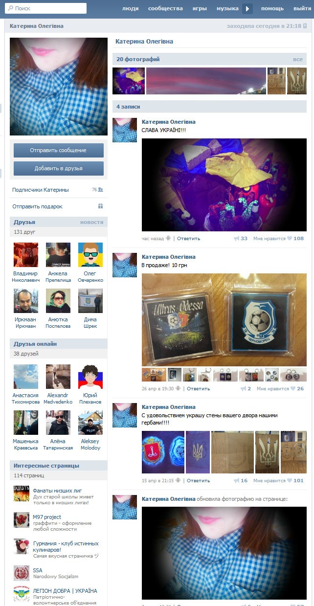 Фото из её ЖЖ. Публикации до сих пор не удалены. Как я понял, она - ярая футбольная фанатка. Очень часто гоняет (гоняла) на матчи одесской команды в другие города б.Украины.