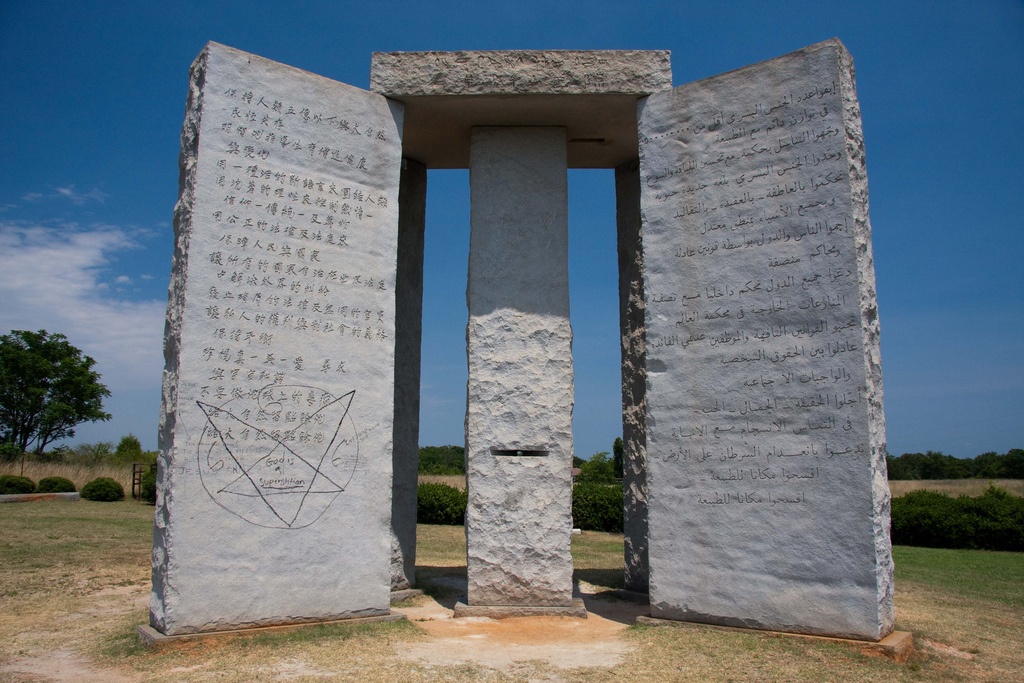 Это Джорджийские скрижали в США. Если памятники сатане стали в этой стране появляться недавно, то Джорджийские скрижали стоят там с 1980 (!) года[1]. Это и есть скрижали англо-иудейского мира, выставленные на смену религиозным прежних веков.