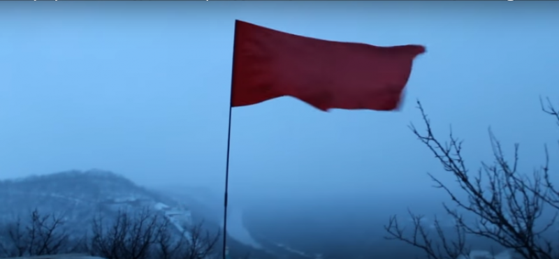 Красный стяг Победы, столь ненавистный бандеровскому режиму, символизируя непокорность Донбасса, гордо развевается на белом зимнем фоне.