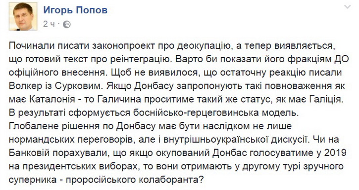 Игорь Попов, депутат Верховной Рады от партии Олега Ляшко, выразил неудовлетворение известием о том, что Петр Порошенко готовится внести в парламент закон «о реинтеграции Донбасса».