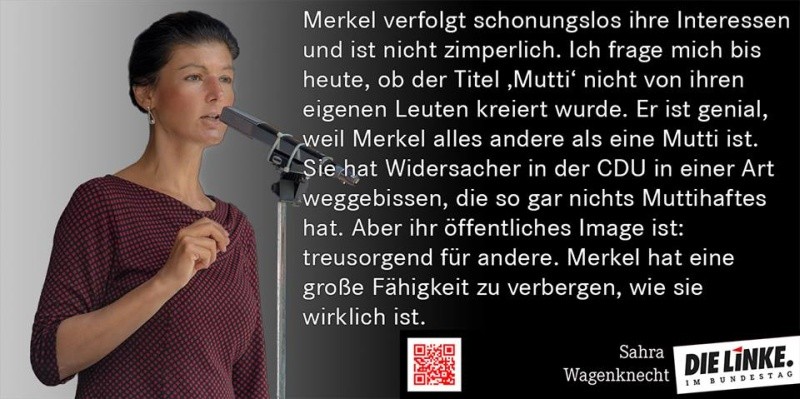 «Канцлер опытная женщина, осознающая свою роль во власти. В то же время Меркель безжалостно преследует свои собственные интересы и не жеманничает, если кого-то необходимо убрать с пути. Это полный контраст с той картинкой, которую знает общественность. Поэтому я до сих пор задаю себе вопрос – а не было ли выдумано прозвище «Mutti» (мамочка) ее собственными советниками. Это просто гениально, так как Меркель может быть кем угодно, только не «мамочкой» - в этом отношении достаточно только вспомнить, как она, совсем не по-матерински, выжила из партии ХДС своих недоброжелателей. Но для общественности она «та, кто заботится о других». У Меркель хорошо получается скрывать то, кем она есть на самом деле», - рассказала лидер немецких Левых.