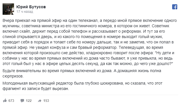 Главред «Цензор.нет» Бутусов возмутился разгулу гомосексуализма вна Украине. С его слов, неназванный советник украинского министра, был на прямом включении в эфире одного из телеканалов, когда за его спиной появился обнаженный мужчина. Упсс