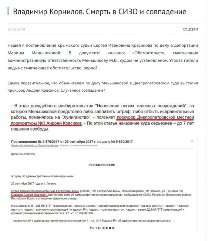 Меня нисколько не удивляет злорадство «вешателя» Филатова. Понимаю, что «мальчики кровавые» таким, как он, не снятся. Не знаю, родственники ли днепропетровский прокурор Андрей Красиков, отправивший девушку в СИЗО, и крымский судья Сергей Красиков, депортировавший её на Украину. Это не важно. Сработали они на пару, как родные. Судья не захотел замечать очевидного, прокурор специально переквалифицировал дело, чтобы девушку закрыли надолго.