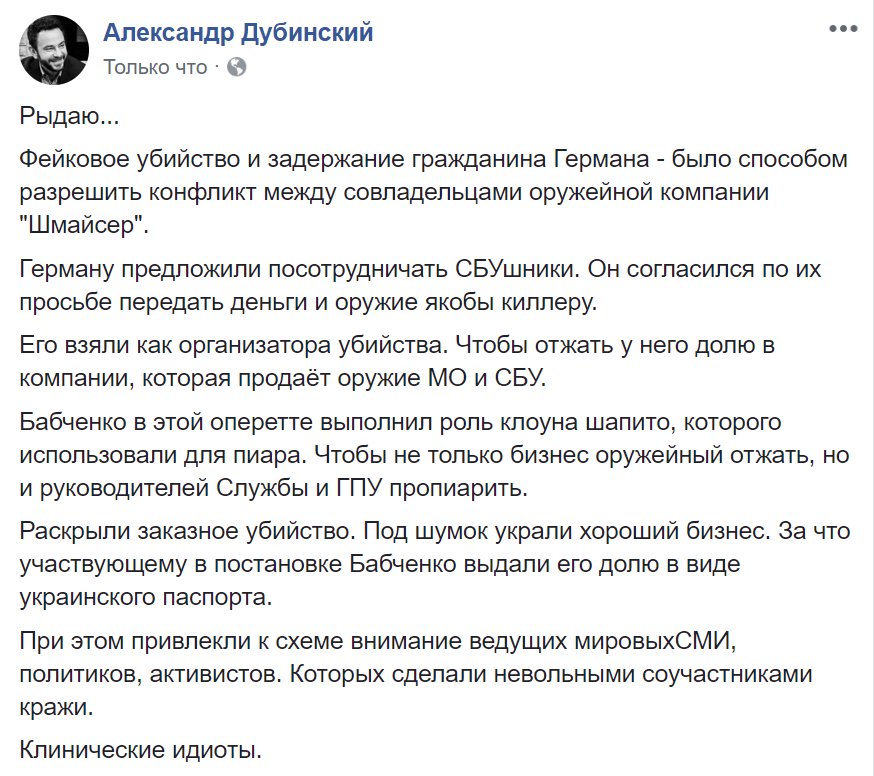 Прямо сейчас Бабченко даёт интервью иностранной прессе, которая в ах.. в шоке. Режиссёр шапито решил, что это лучший способ смахнуть говно под стол. Но, поскольку всё делается в спешке, правдоподобное враньё придумать не смогли. Помните, как на брифинге, посвященном воскрешению ("Бабченко в студию!" Я думала, что его вынесут в чёрном ящике), Аркадий просил прощения у своей жены: "Ольга, дорогая, прости. Но так было надо"?