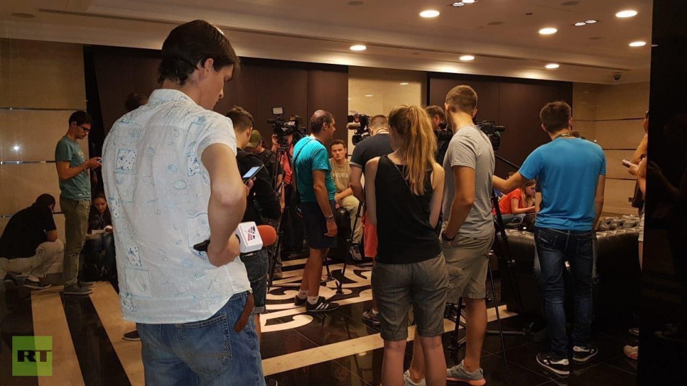 Журналисты в ожидании экстренной пресс-конференции Председателя Народного Совета Дениса Пушилина и заместителя председателя Совета Министров ДНР Дмитрия Трапезникова. Фото: Андрей Бабицкий 31.08.18 Донецк, ДНР.