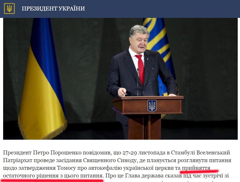 Вот и в этот раз сайт президента Украины анонсировал: «Петр Порошенко сообщил, что 27-29 ноября в Стамбуле Вселенский Патриархат проведет заседание Священного Синода, где планируется рассмотреть вопрос об утверждении Томоса об автокефалии украинской церкви и принятия окончательного решения по этому вопросу».