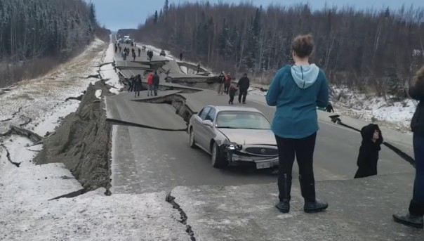 Легковой автомобиль оказался в ловушке после того, как провалился вместе с участком дороги – обрушение трассы произошло во время сильного землетрясения на Аляске. Источник