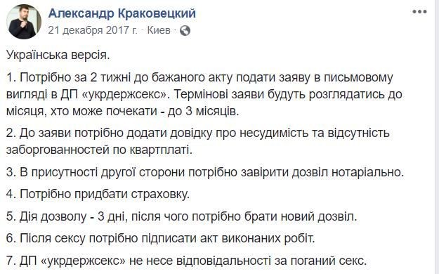 Скажем, предлагается создать госпредприятие «Укрдержсекс», куда подавать письменные заявки на желанный акт, прилагая справки о несудимости, отсутствии задолженности за коммунальные услуги и медицинское освидетельствование кожвендиспансера. После положительного рассмотрения комиссии подавателям выдают державный акт согласия на проведения специальных интимных мероприятий…