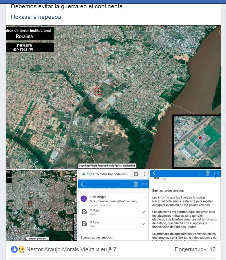 Ряд бразильских СМИ обратился к российской негосударственной организации по борьбе с государственным терроризмом "CST command" с просьбой прокомментировать публикуемое в социальных сетях письмо венесуэльских военных, в котором содержатся призывы не допустить военной интервенции с территории сопредельных государств, а также сообщается о готовности вооружённых сил Венесуэлы нанести в случае интервенции ответный удар по территории агрессора и в том числе не только по военным объектам, но и по центрам "институционального террора".