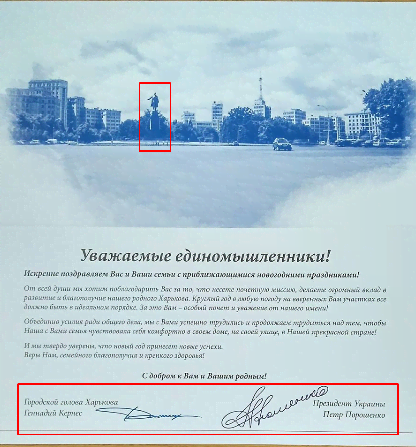 На новогодних открытках, которые были разосланы всем харковчанам, был изображен снесенный майданщиками памятник Ленину и подпись «Кернес-Порошенко». Это было определенным сообщением харковчанам, потому что Кернес сам тщательно осматривает любые предвыборные материалы. Назвать это случайностью и ошибкой исполнителя нельзя», – рассказал Кеворкян. Источник