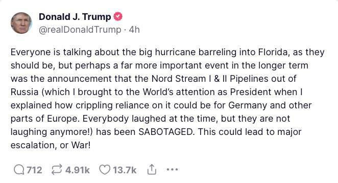 И даже Трамп сказал своё слово: «Все говорят о большом урагане, обрушившемся на Флориду, но, возможно, гораздо более важное событие в долгосрочной перспективе — это сообщение о том, что в отношении трубопроводов “Северный поток-1 и 2” были совершены диверсии. Это может привести к крупной эскалации или к войне».