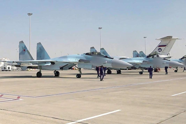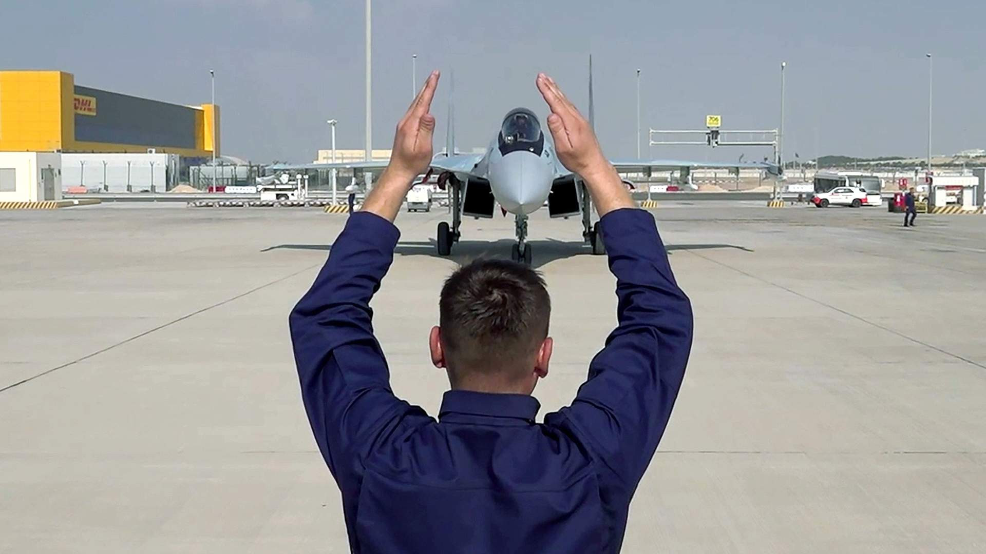 Многоцелевые истребители Су-35С, сопровождавшие самолет с президентом Российской Федерации Владимиром Путиным, на аэродроме в Абу-Даби
