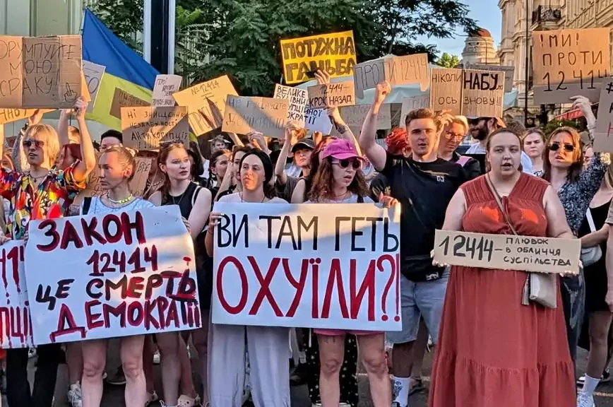 Обилие непечатных слов на картонках зашкаливает, однако, обратите внимание, ругательства обращены не напрямую к Зеленскому (а он мстительный организм), а «взагали», в общем. И это тоже с умыслом, чтобы вскоре, а может, прямо сегодня, Зеленский — которого также танцуют западные друзья — смягчил закон, и всем «не лохам» была продемонстрирована процедура демократии.
