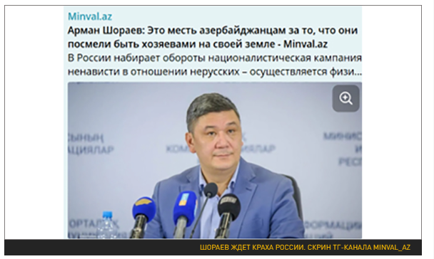К конфликту, раздутому официальным Баку, подключаются радикалы из республик СНГ. Казахский русофоб и националист Арман Шораев в интервью minival.az заявил, что основная причина "гонений" в России – демографический кризис. Шораев злорадствует: