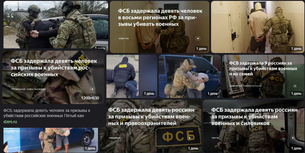 В восьми регионах РФ задержали девять россиян, призывавших к убийствам российских военнослужащих, сотрудников правоохранительных органов и членов их семей. Речь идёт о Краснодарском крае, Астраханской, Владимирской, Мурманской, Омской, Херсонской, Ярославской областях и Еврейской автономной области. Возбуждены уголовные дела, сообщили в ФСБ.