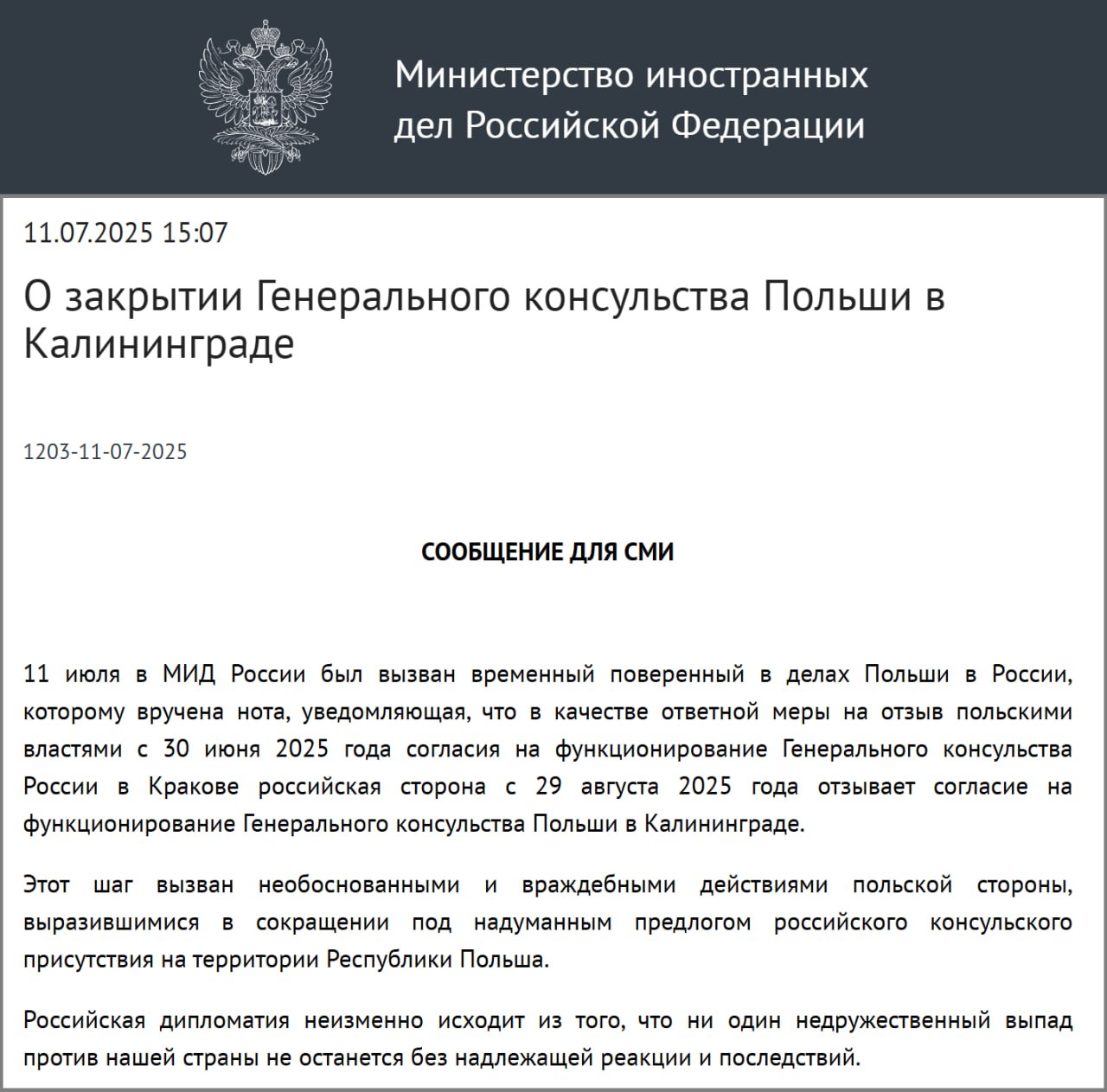 Российский МИД объявил о закрытии польского консульства в Калининграде.