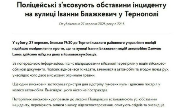 «В субботу, 27 сентября, около 19.30 в Тернопольское районное управление полиции поступило сообщение о том, что на улице Иванны Блажкевич водитель автомобиля Daewoo Lanos совершил наезд на двоих военнослужащих», — говорится в сообщении.